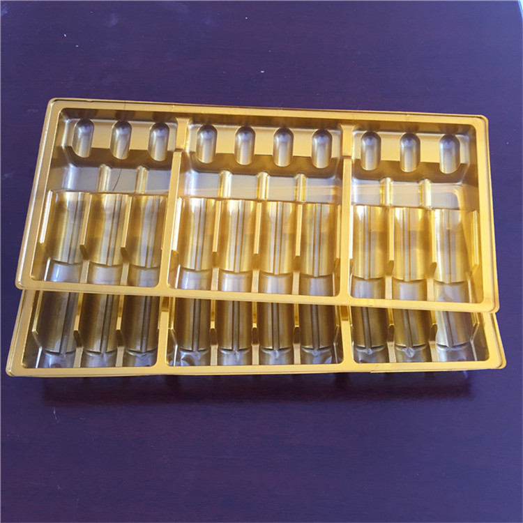 在選用吸朔加工工藝將全透明的塑膠片材制成特殊的突起形的全透明塑膠罩于F品表層,具有維護及其清理商品的功效,將一般的塑膠硬,在表層上沾到一層溶質的原材料,進而使拖盤表層有一種溶質的觸感以用于提升包裝用品的級別,選用獨特I藝改性工程塑料的吸塑托盤該原材料表層的電阻器值低于10的11次放歐母.適用于電子器件.I商品的靜電感應拖盤。